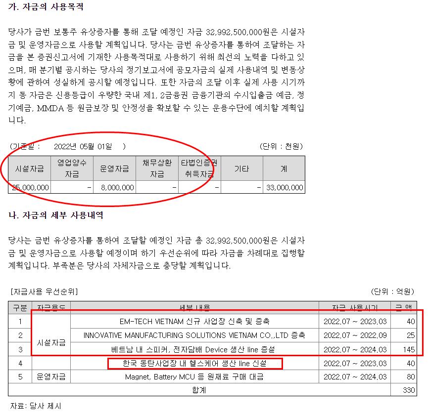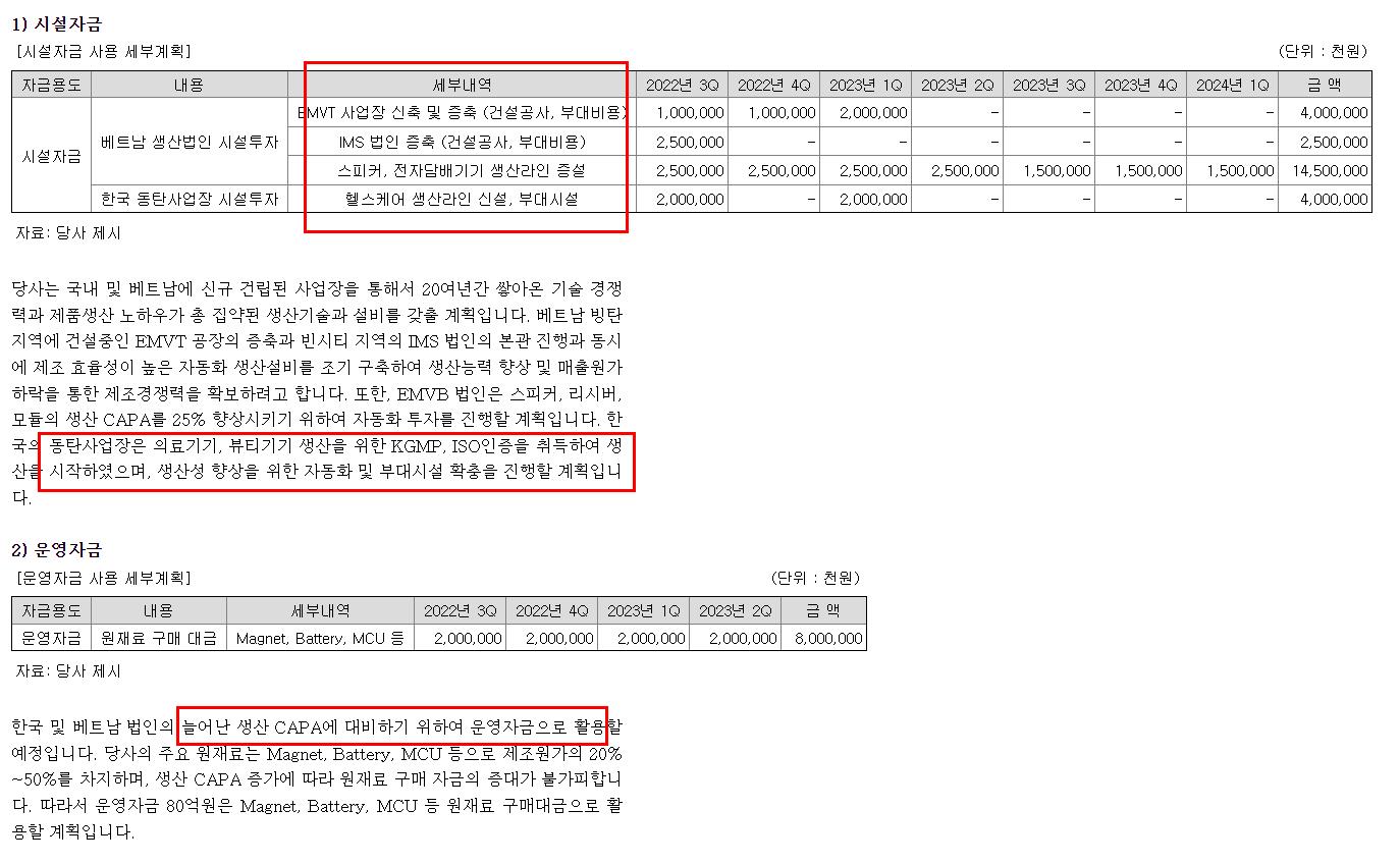 시설 자금 중 스피커, 전자담배기기 생산라인 증설 금액이 가장 크다. 2024년 1분기까지 계속 투자가 일워지고 7개 분기동안 145억의 투자가 진행된다.