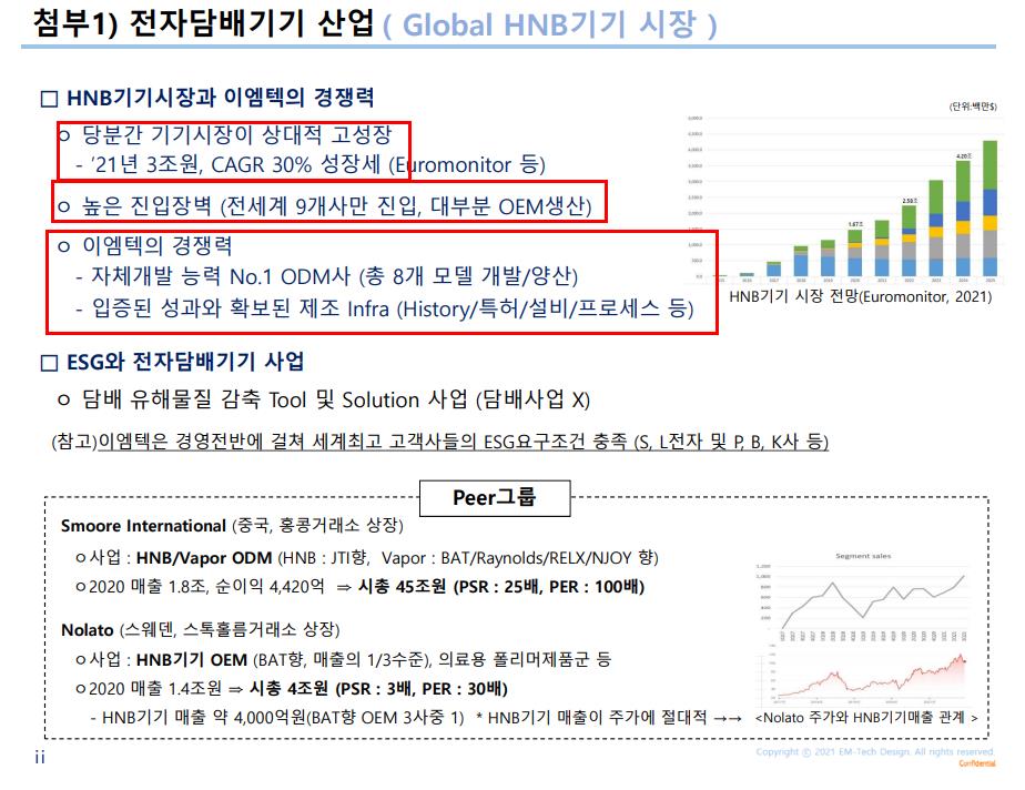 전자 담배 사업만으로 지금의 이엠텍 주가는 그리 비싸진 않은 상황.