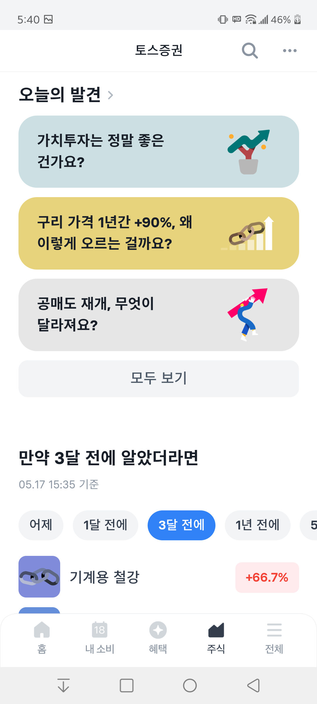 모바일로 보는 게 쉽지 않아서 이벤트로 주식을 받았어도 매매거래를 하지 않아 선물로 받은 LG디스플레이는 -15% 손실이 난 상태였지만, 덕분에 안 보던 토스 앱을 켜서 뭐가 있는지 살펴봤네요.