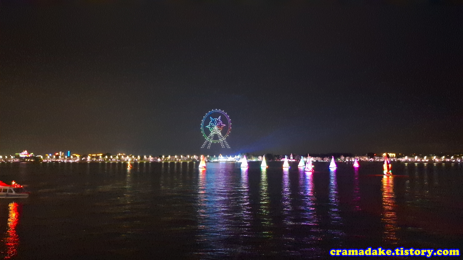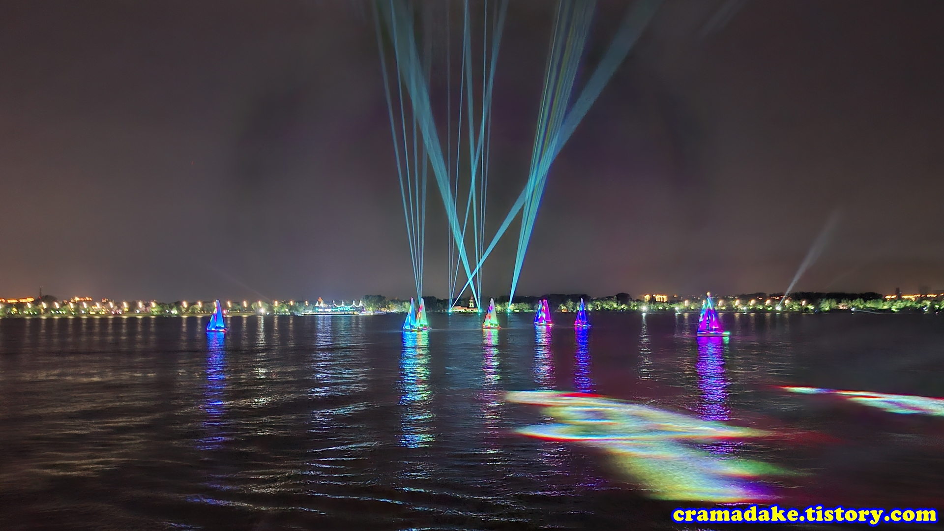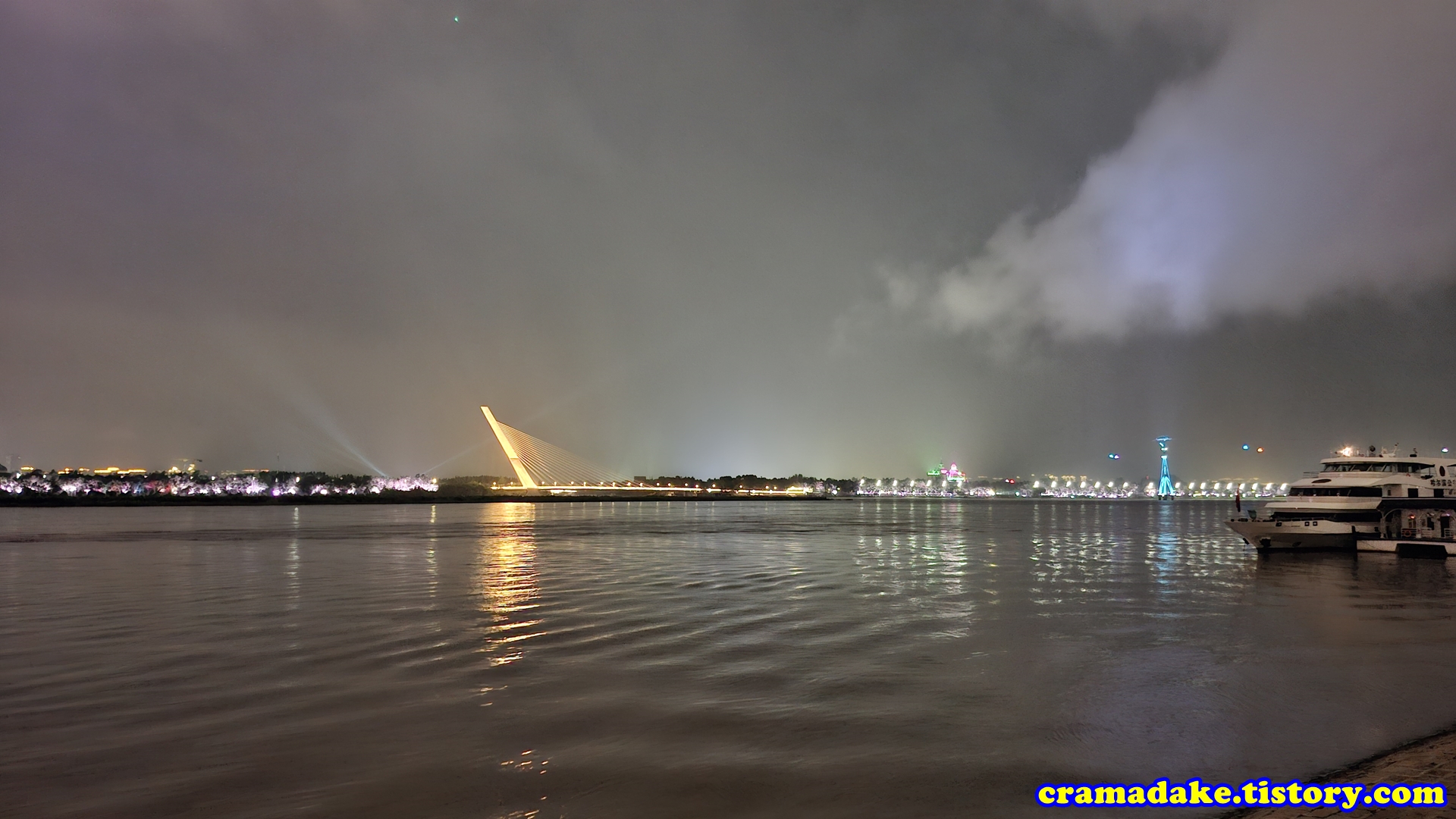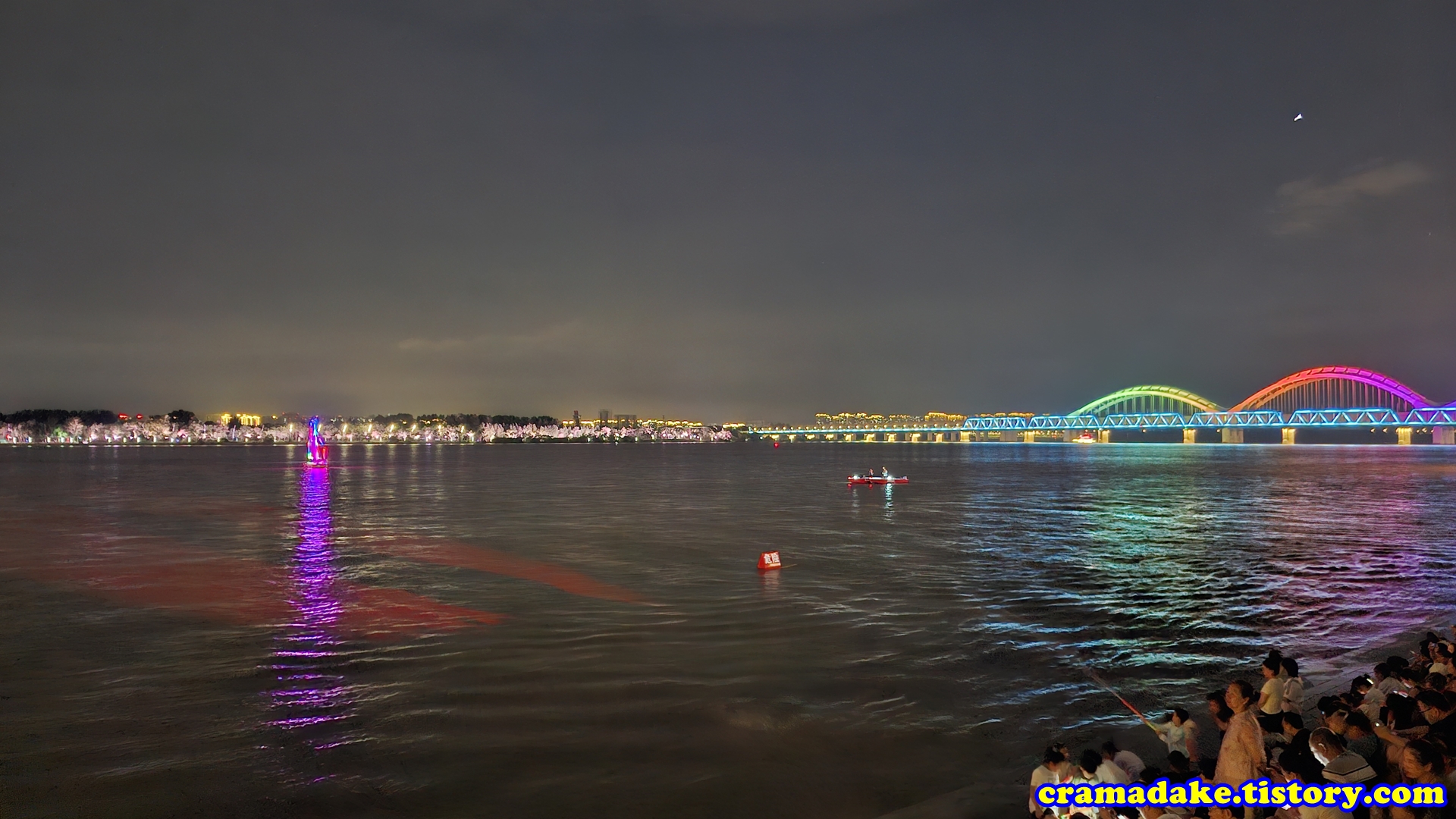 높은 분들이 강건너편 태양도 쪽에서 관람하는가 봐요. 저 포함 많은 관광객들이 바글거리는 저희 쪽이 아니라 건너편에서 한자가 보이게 떠 있더라고요. 뭐 그렇다고요.ㅋㅋㅋ