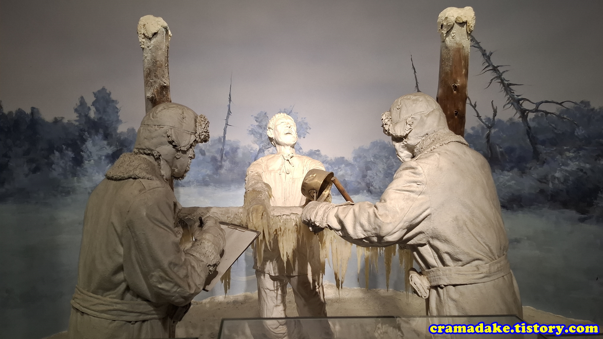 영하 20-30도는 우습게 떨어지는 곳에 사람을 야외에 묶어놓고 팔에 물을 붓는 실험을 했으니, 감각이 무뎌지겠죠....