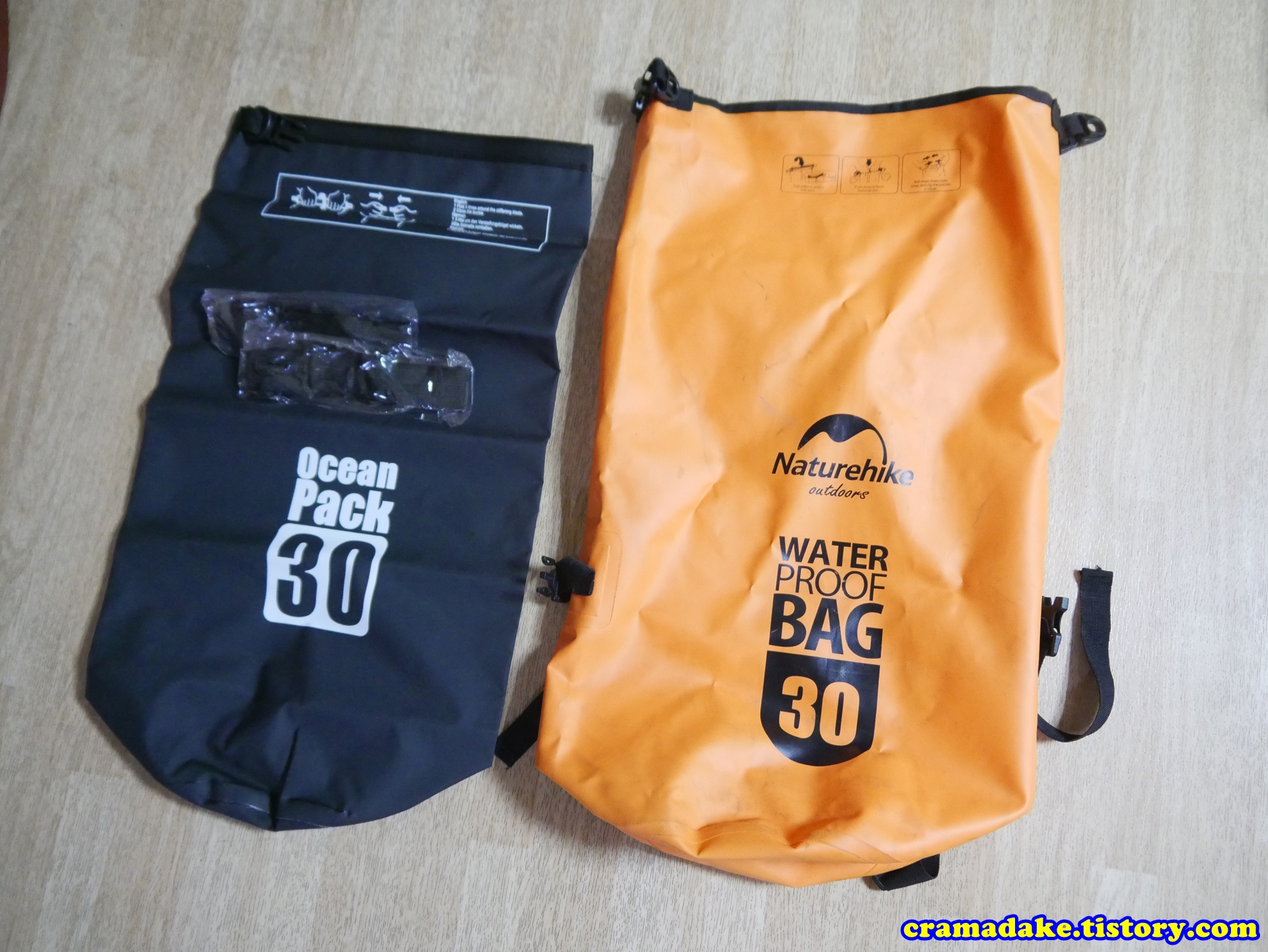 검은색 30리터 짜리 방수팩은 세계일주 당시 쓰던 노란색 20리터 짜리대비 공간이 넓은데다, 전국 일주 당시 같은 30리터였던 주황색 대비 때가 덜 타서 구입했다.